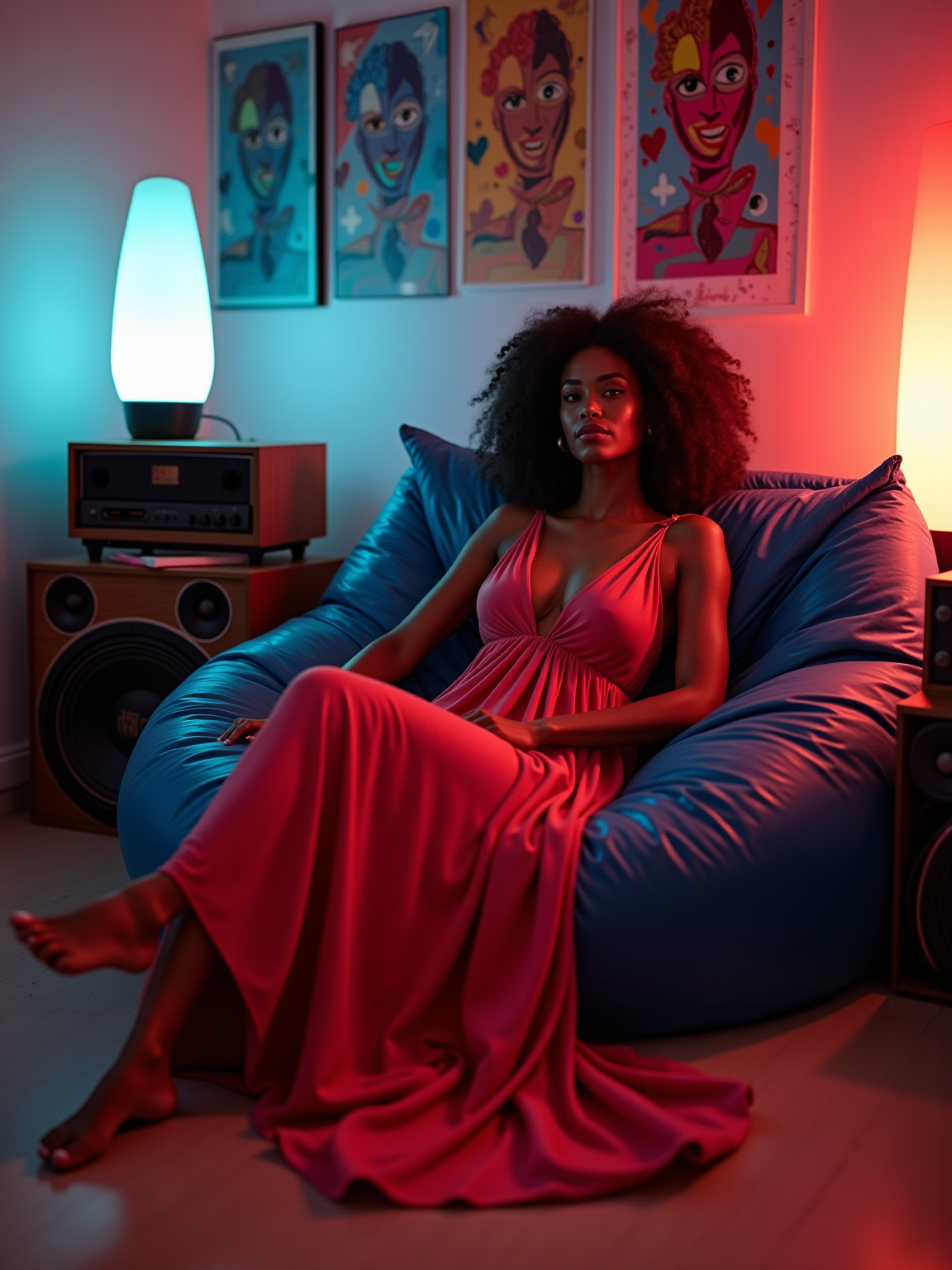 model lounging on a bean bag chair with vinyl pillows, wearing a flowing maxi dress with bell sleeves , surrounded by floor speakers and a component stereo system, op art and Andy Warhol prints on walls, lava lamp and fiber optic lamp creating ambient mood lighting