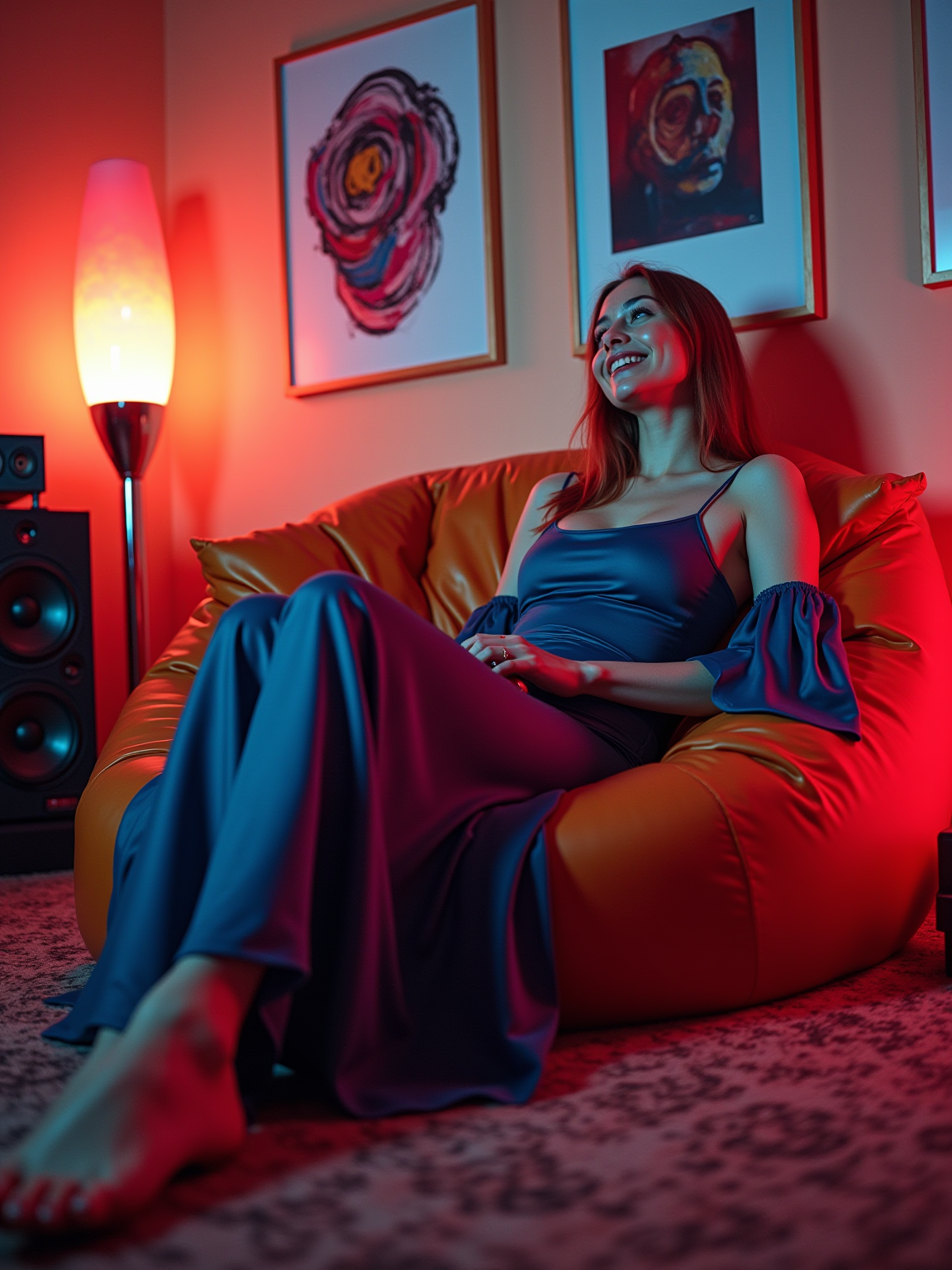 model lounging on a bean bag chair with vinyl pillows, wearing a flowing maxi dress with bell sleeves , surrounded by floor speakers and a component stereo system, op art and Andy Warhol prints on walls, lava lamp and fiber optic lamp creating ambient mood lighting