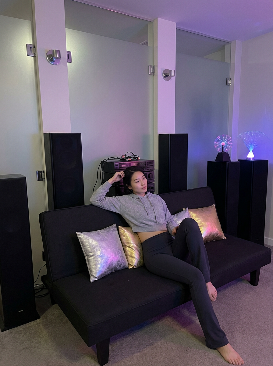 model lounging on a futon with metallic pillows, wearing a cropped hoodie with yoga pants , surrounded by tower speakers and a component stereo system, frosted glass and chrome decor on walls, plasma ball and fiber optic decorations creating ambient lighting
