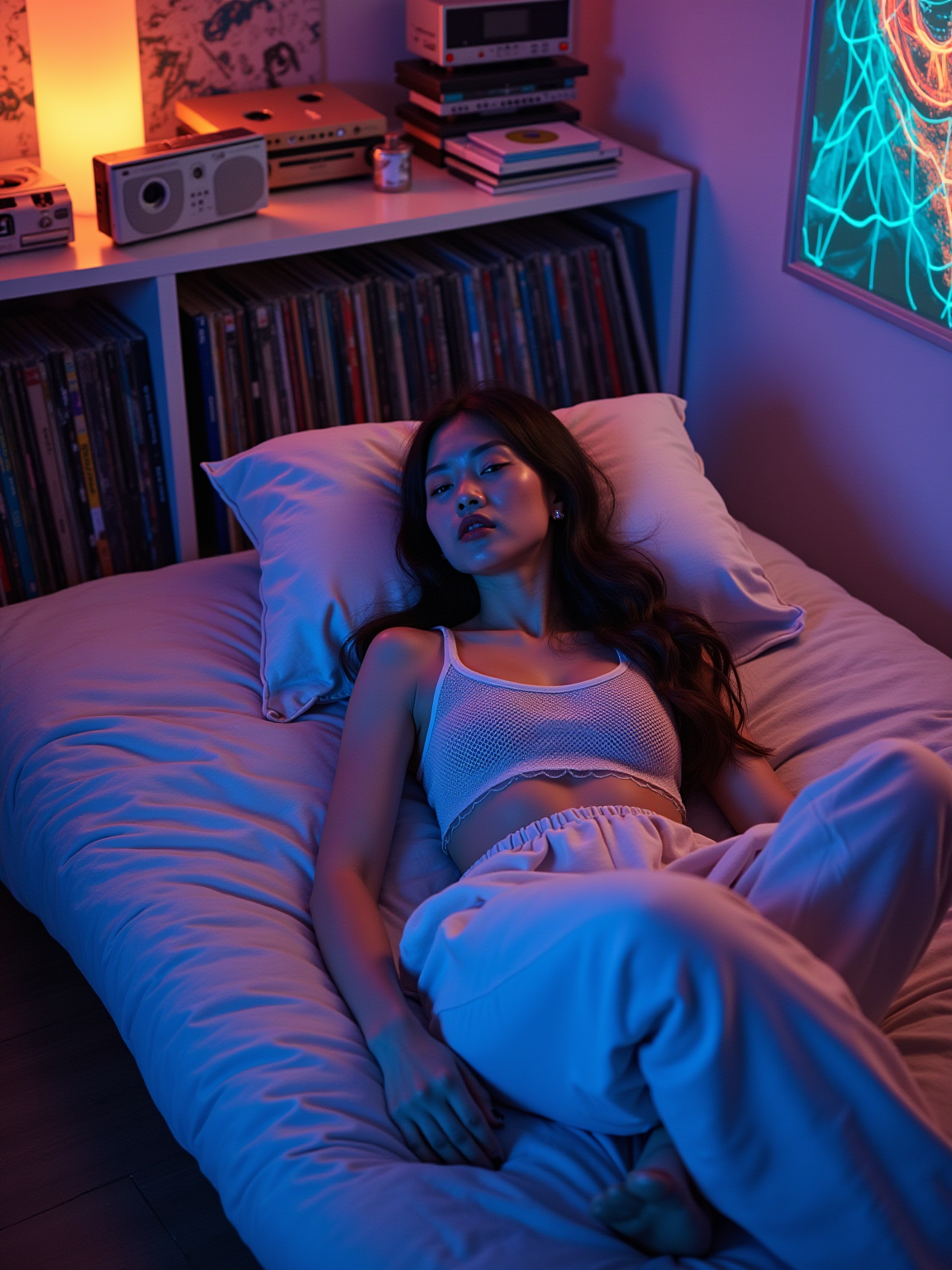 model lounging on a futon with tie-dye pillows, wearing a mesh top over a sports bra with baggy pants , surrounded by Discman players and CD albums, geometric art on walls, blacklight poster glowing under purple lighting