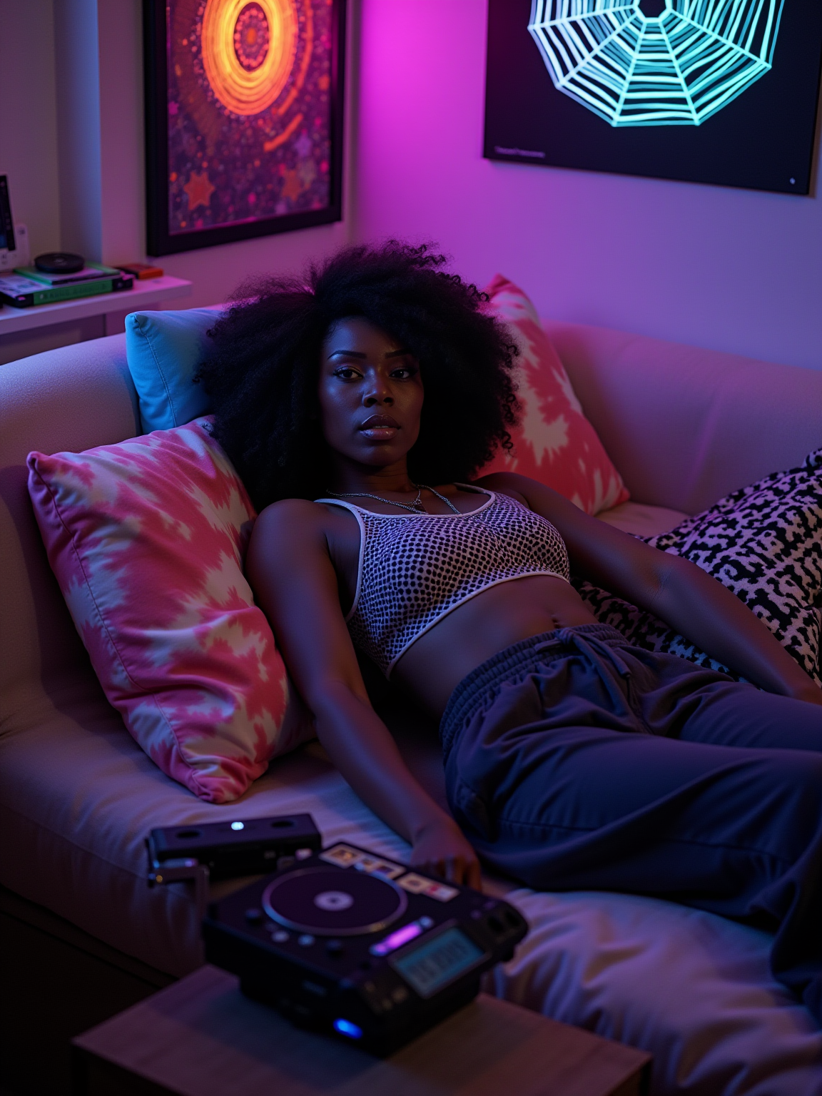 model lounging on a futon with tie-dye pillows, wearing a mesh top over a sports bra with baggy pants , surrounded by Discman players and CD albums, geometric art on walls, blacklight poster glowing under purple lighting