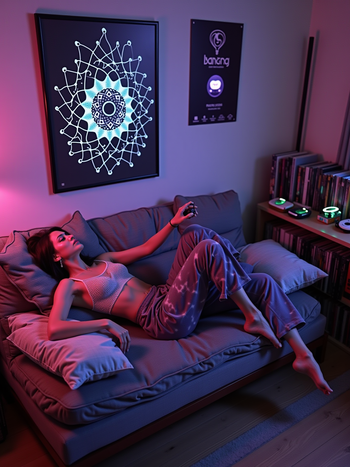 model lounging on a futon with tie-dye pillows, wearing a mesh top over a sports bra with baggy pants , surrounded by Discman players and CD albums, geometric art on walls, blacklight poster glowing under purple lighting