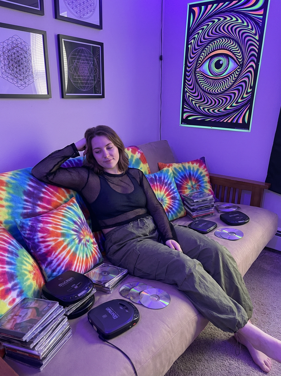 model lounging on a futon with tie-dye pillows, wearing a mesh top over a sports bra with baggy pants , surrounded by Discman players and CD albums, geometric art on walls, blacklight poster glowing under purple lighting