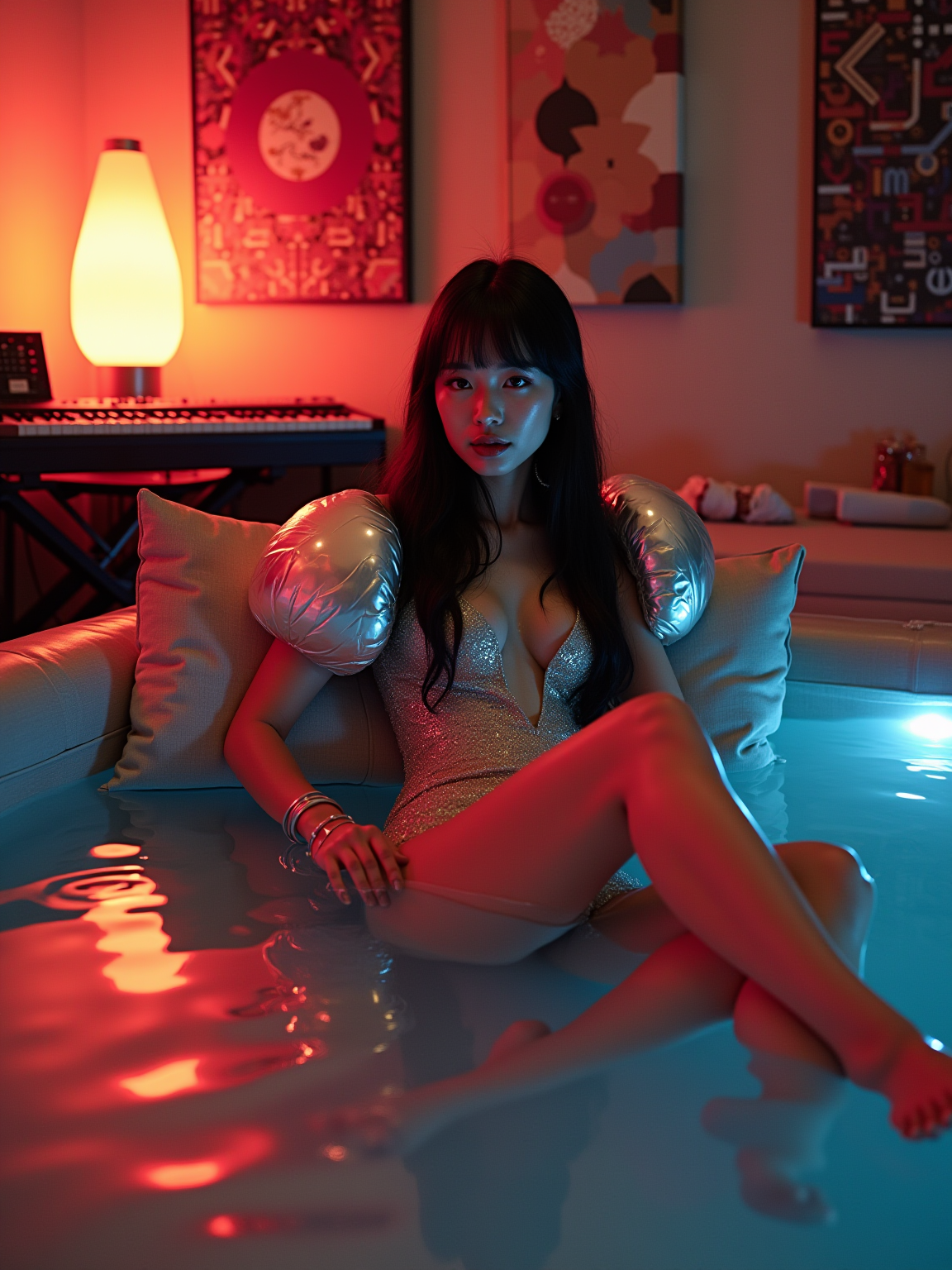 model lounging on a waterbed with metallic pillows, wearing shimmery disco outfit with huge shoulder pads , surrounded by electronic keyboards and drum machines, geometric abstract art on walls, lava lamp and fiber optic lamp creating ambient lighting
