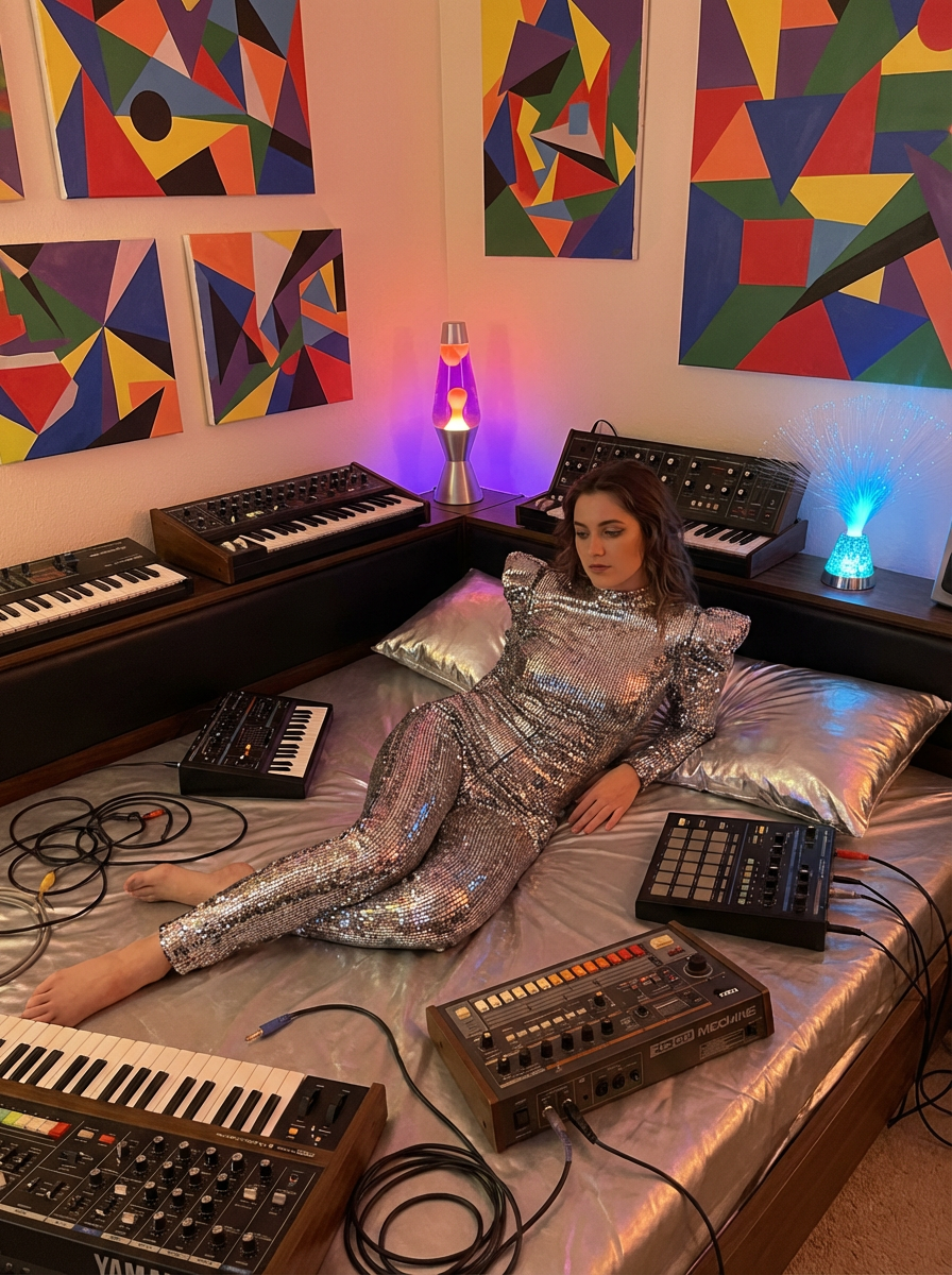 model lounging on a waterbed with metallic pillows, wearing shimmery disco outfit with huge shoulder pads , surrounded by electronic keyboards and drum machines, geometric abstract art on walls, lava lamp and fiber optic lamp creating ambient lighting