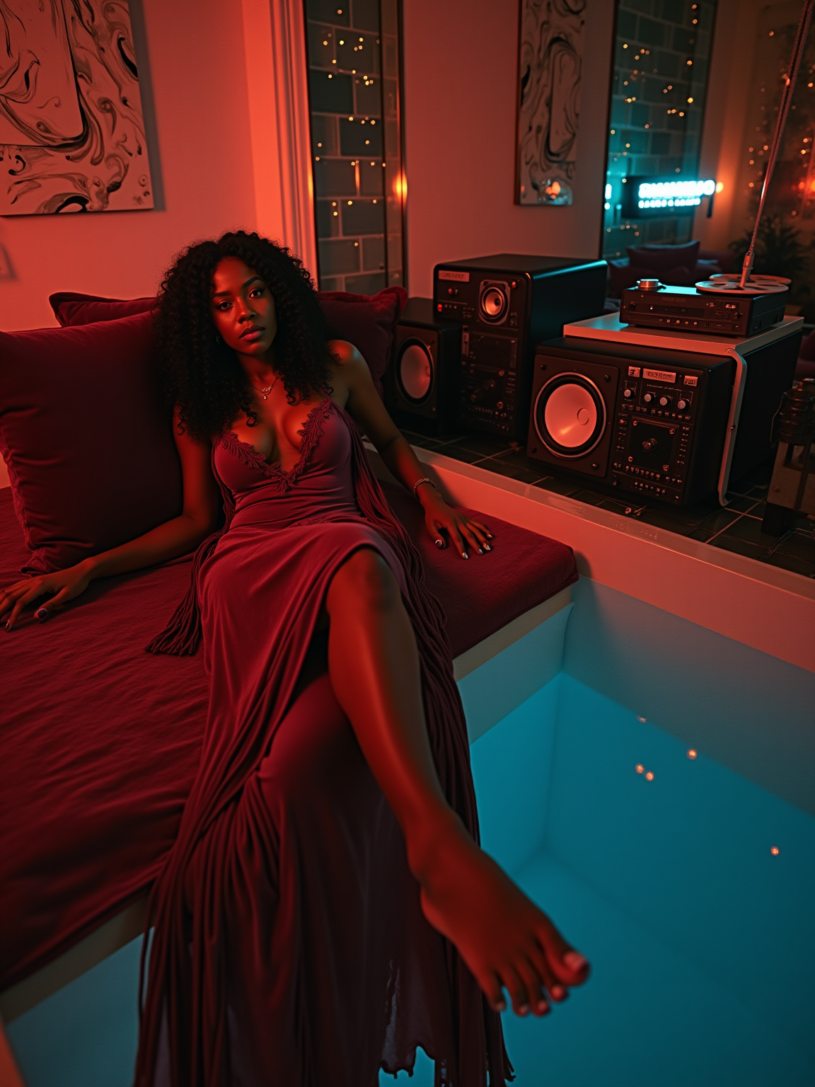 model lounging on a waterbed with velvet pillows, wearing a flowing maxi dress with fringe details , surrounded by quadraphonic speakers and a reel-to-reel tape deck, abstract art and mirror tiles on walls, fiber optic lamp and black light creating ambient mood lighting