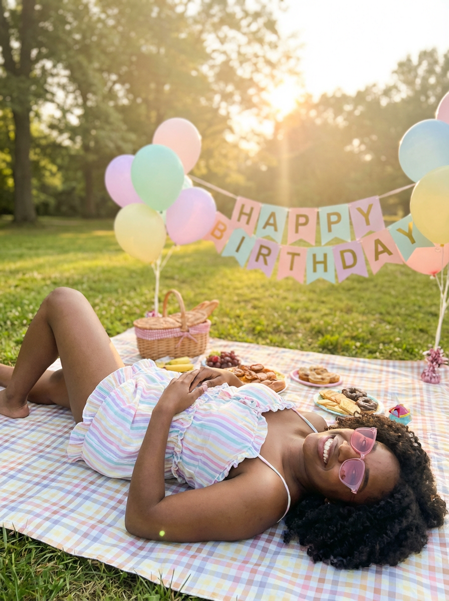 model lying back on a picnic blanket, relaxed and happy, wearing a cute pastel romper with frills and pink sunglasses , birthday picnic aesthetic with soft lighting