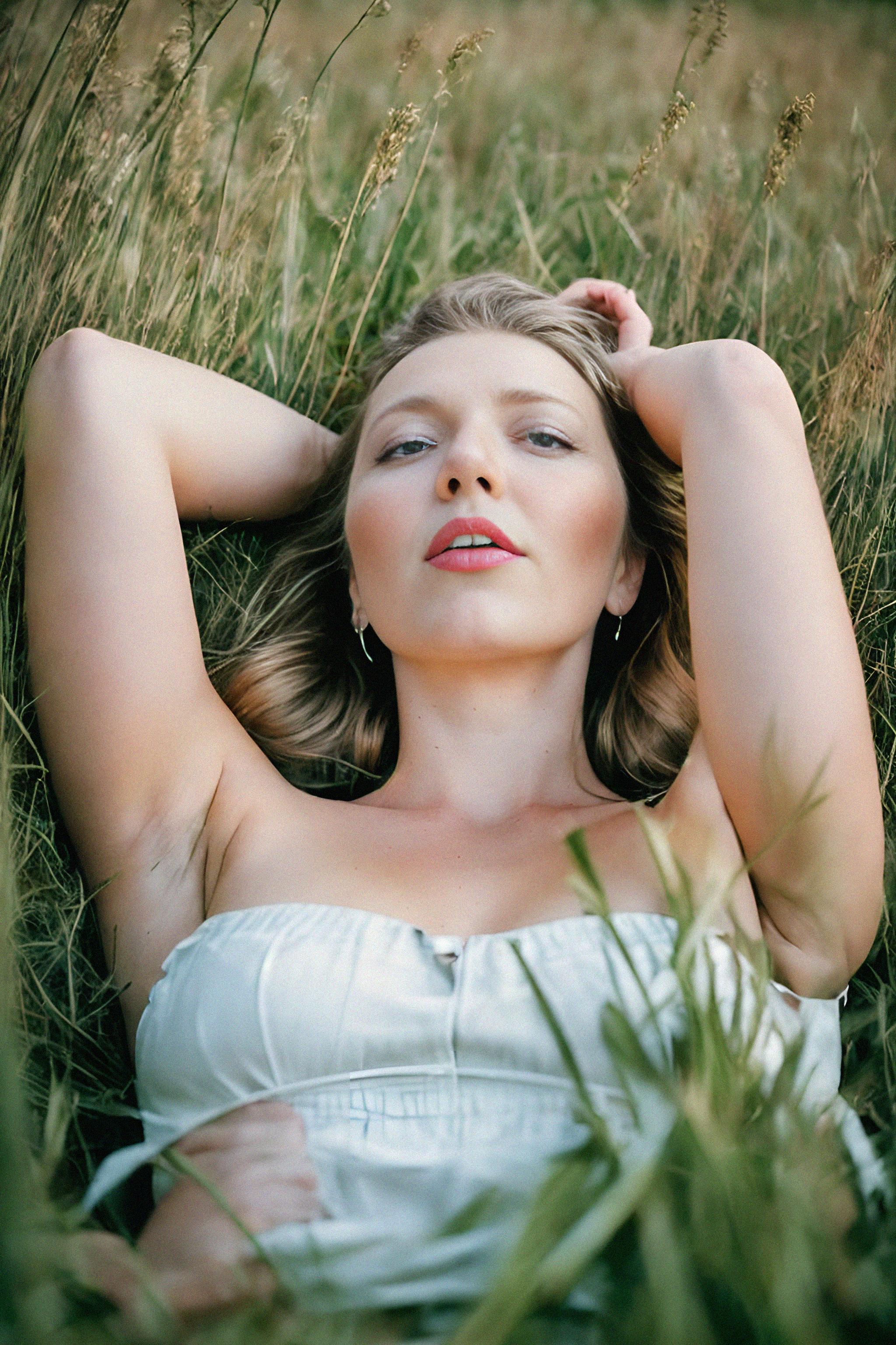 model lying in a field of tall grass, gazing up at the endless expanse of the sky, feeling a profound connection with the vastness of nature