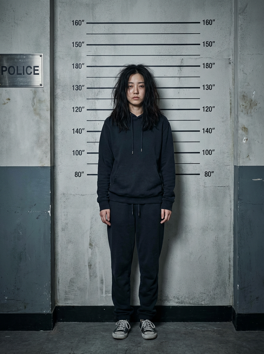 model mugshot with disheveled hair, tired expression, height measurement lines on wall behind, police station aesthetic