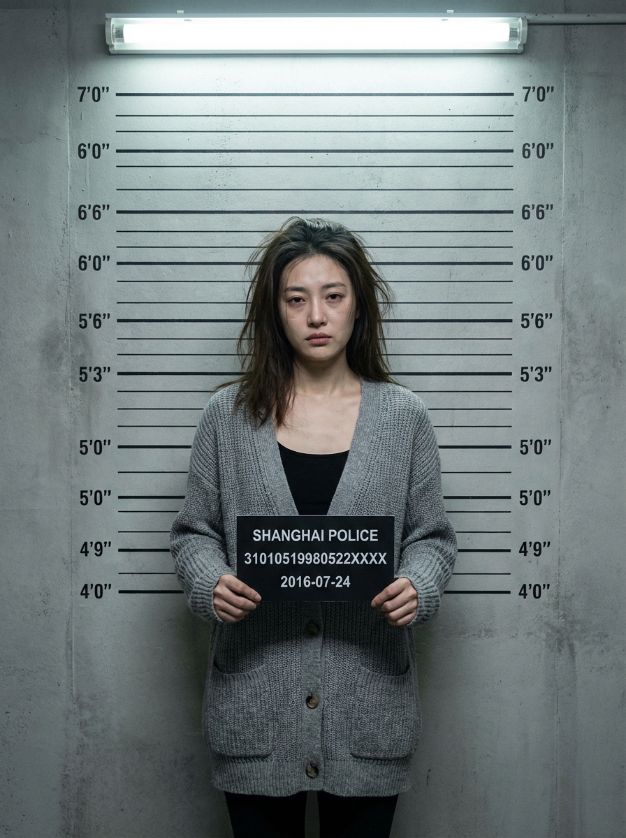 model mugshot with disheveled hair, tired expression, height measurement lines on wall behind, police station aesthetic
