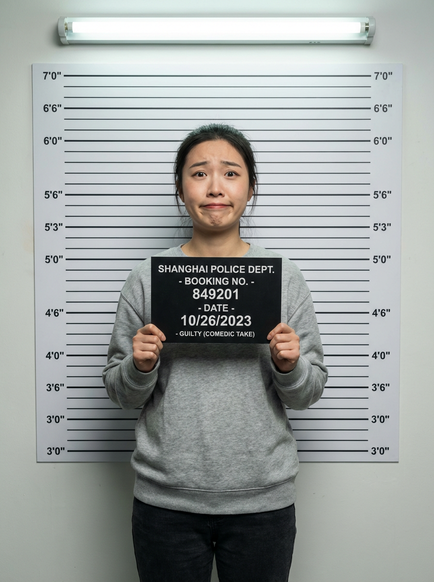 model mugshot with exaggerated guilty expression, comedic take, standard booking format