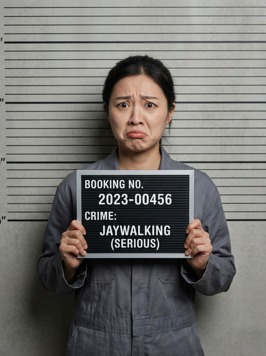 model mugshot with exaggerated guilty expression, comedic take, standard booking format