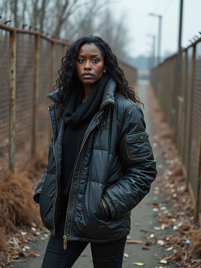 model near Chernobyl reactor sarcophagus, surrounded by rusting fences and overgrown debris. wearing black boots and black weathered jacket