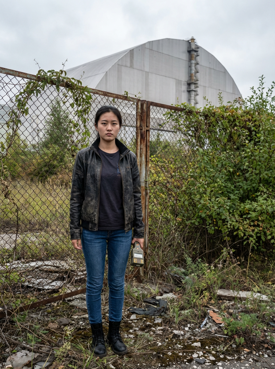 model near Chernobyl reactor sarcophagus, surrounded by rusting fences and overgrown debris. wearing black boots and black weathered jacket