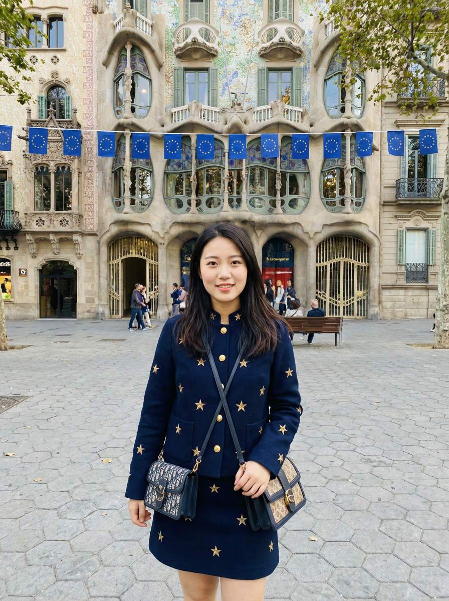 model on a Barcelona street decorated with European flags, wearing a stylish blue and gold outfit with star patterns , Gaudi's architecture visible in the background, embodying modern European city style