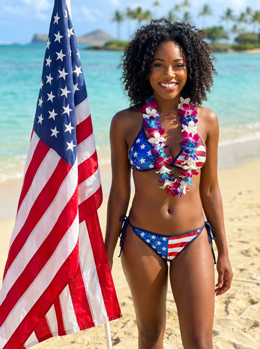 model on a beautiful beach in Hawaii, wearing a stars and stripes bikini with sequins , with a lei of red, white and blue flowers around her neck, American flag planted proudly in the sand, crystal blue waters in the background