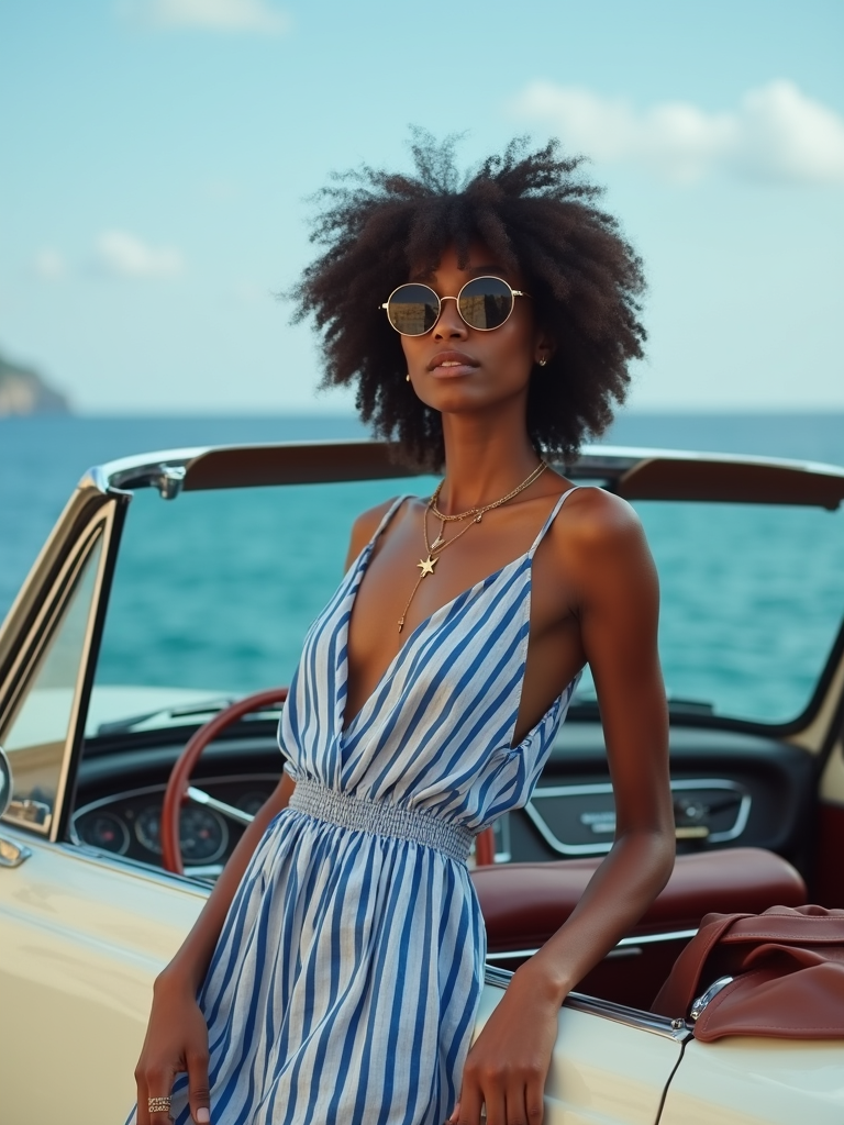 model on a classic European road trip, leaning against a vintage convertible on a coastal road in Amalfi, wearing a blue and white sundress with star accessories , Mediterranean Sea stretching behind, embodying freedom and European adventure
