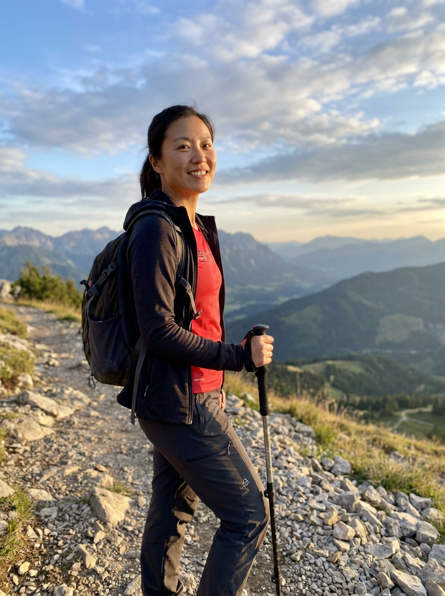 model on a hiking trail, overlooking a breathtaking mountain landscape