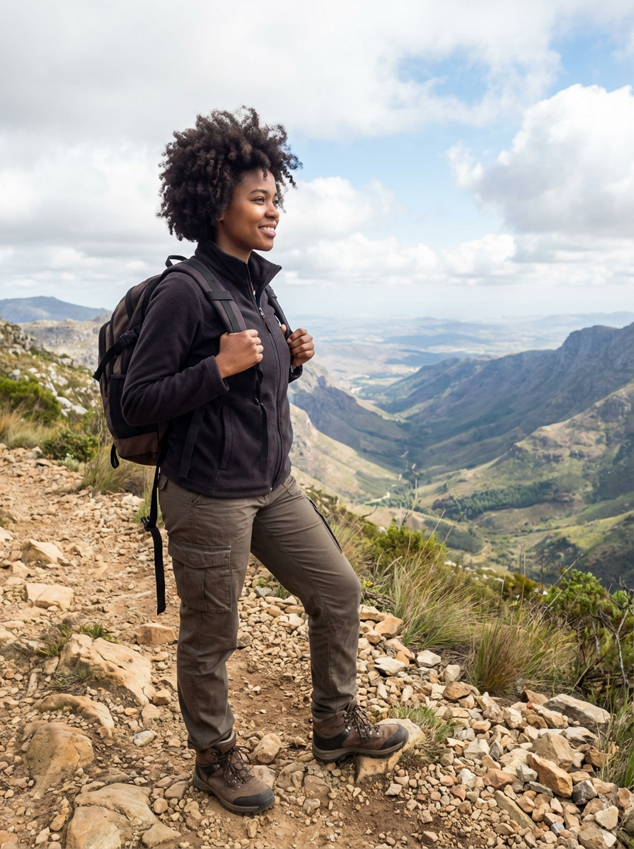 model on a hiking trail, overlooking a breathtaking mountain landscape