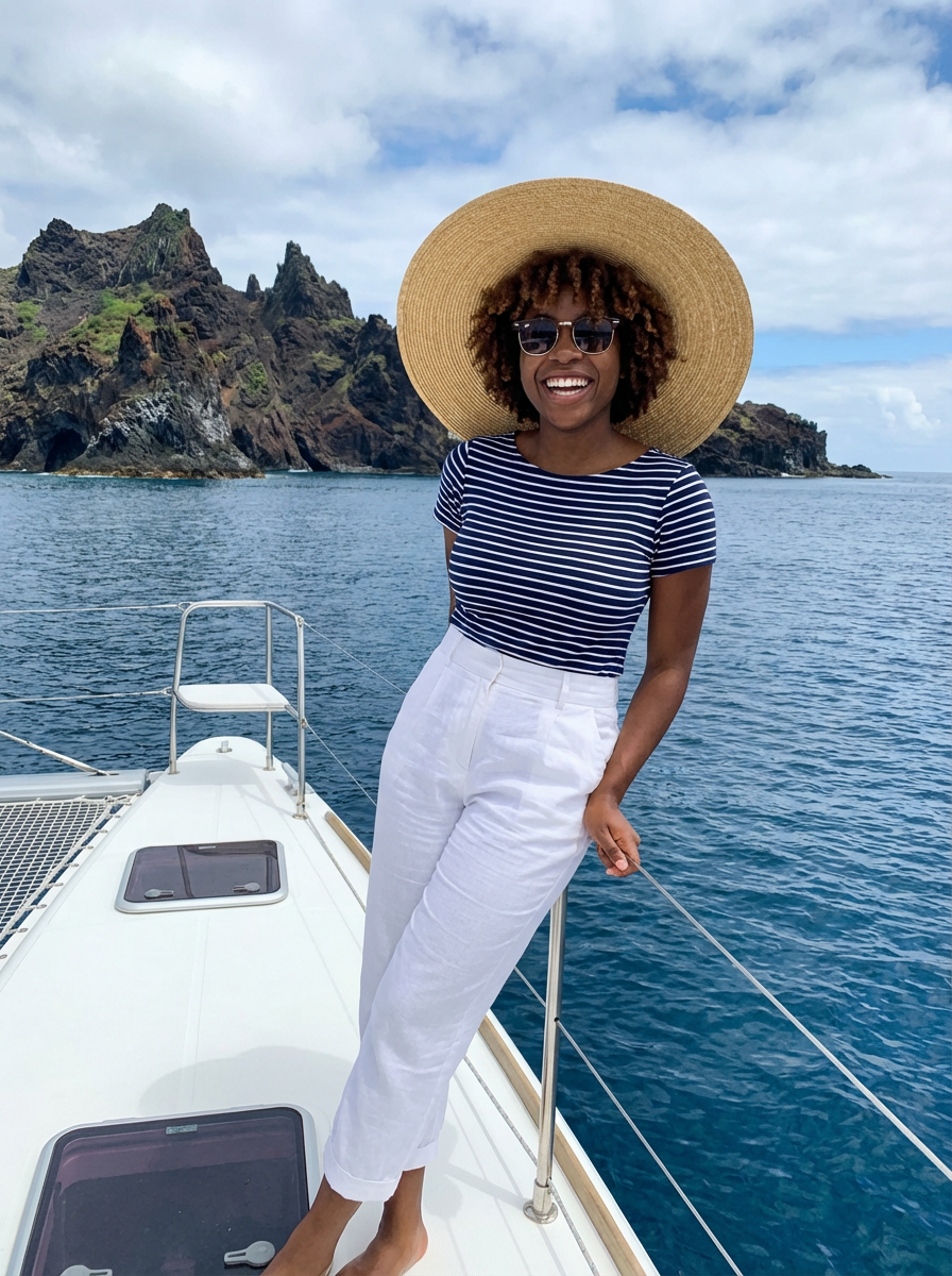 model on a luxury catamaran cruise, wearing a nautical-inspired outfit with wide-brimmed hat , sailing past volcanic islands