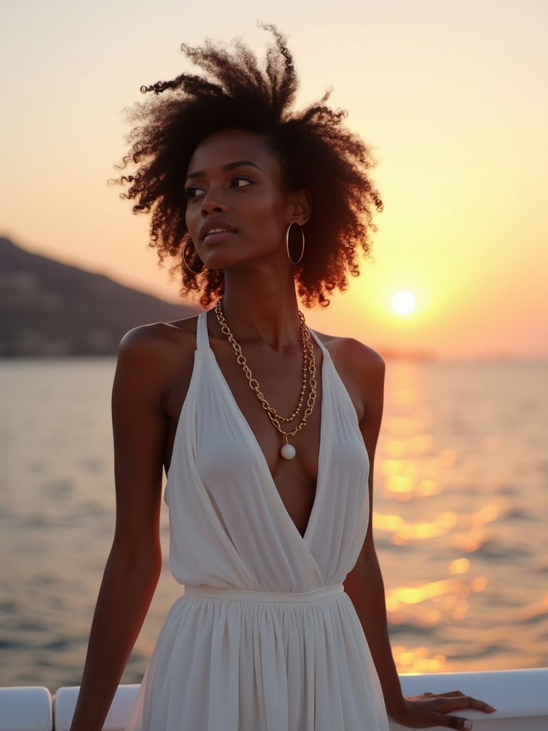 model on a luxury yacht at sunset, wearing a white resort wear with gold accents , Mykonos coastline in background