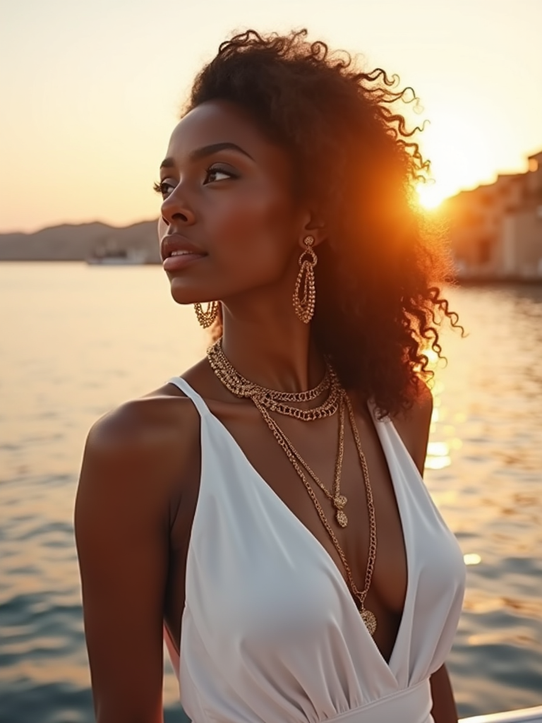 model on a luxury yacht at sunset, wearing a white resort wear with gold accents , Mykonos coastline in background