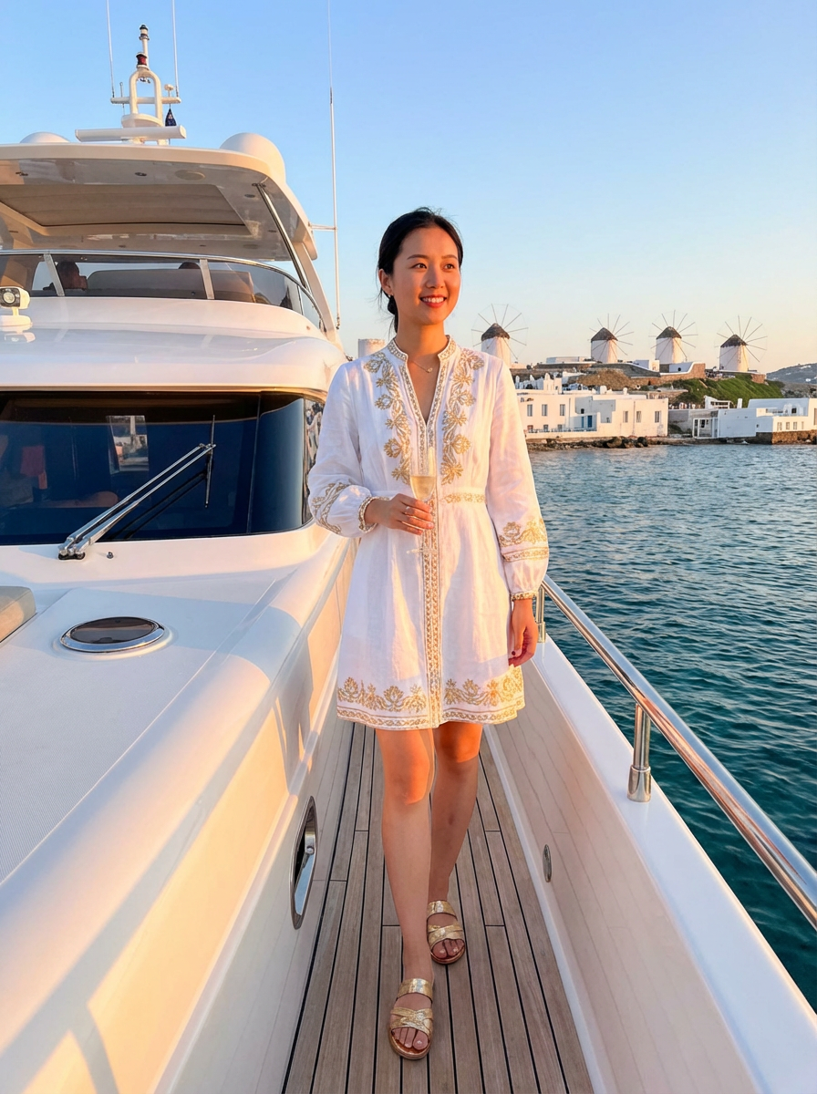 model on a luxury yacht at sunset, wearing a white resort wear with gold accents , Mykonos coastline in background