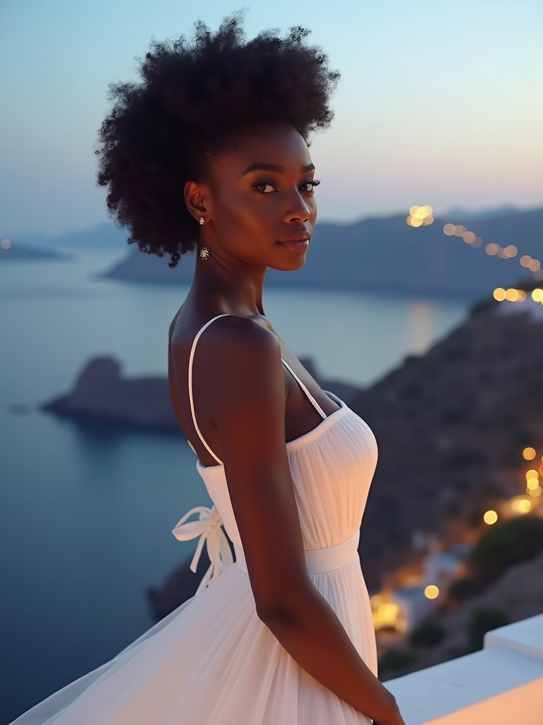 model on a private terrace overlooking Mykonos Town, wearing a glamorous white evening gown , twinkling city lights below