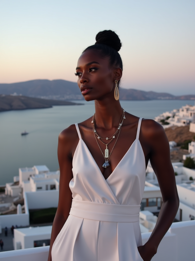 model on a rooftop bar in Mykonos Town, wearing a sophisticated white jumpsuit with statement jewelry , island panorama at dusk