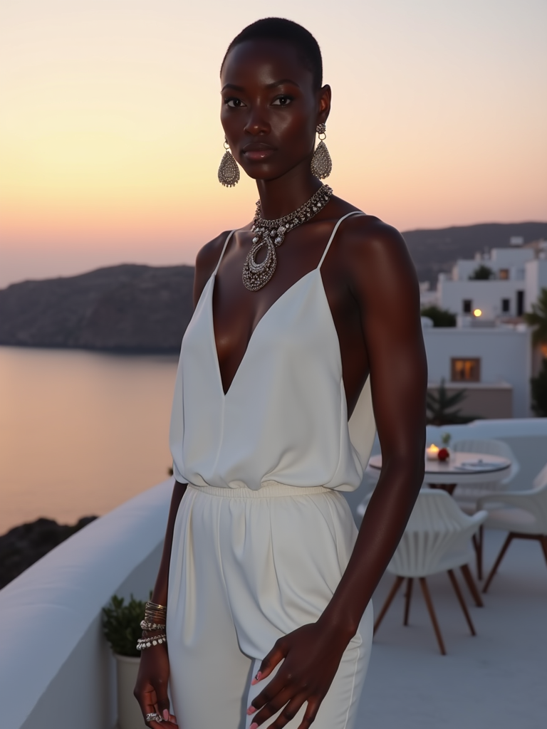 model on a rooftop bar in Mykonos Town, wearing a sophisticated white jumpsuit with statement jewelry , island panorama at dusk