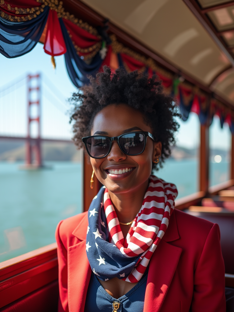 model on a San Francisco trolley decorated with patriotic bunting, wearing a stylish red, white and blue outfit with a stars and stripes scarf , Golden Gate Bridge draped with a giant American flag visible in the background, embodying iconic American city pride