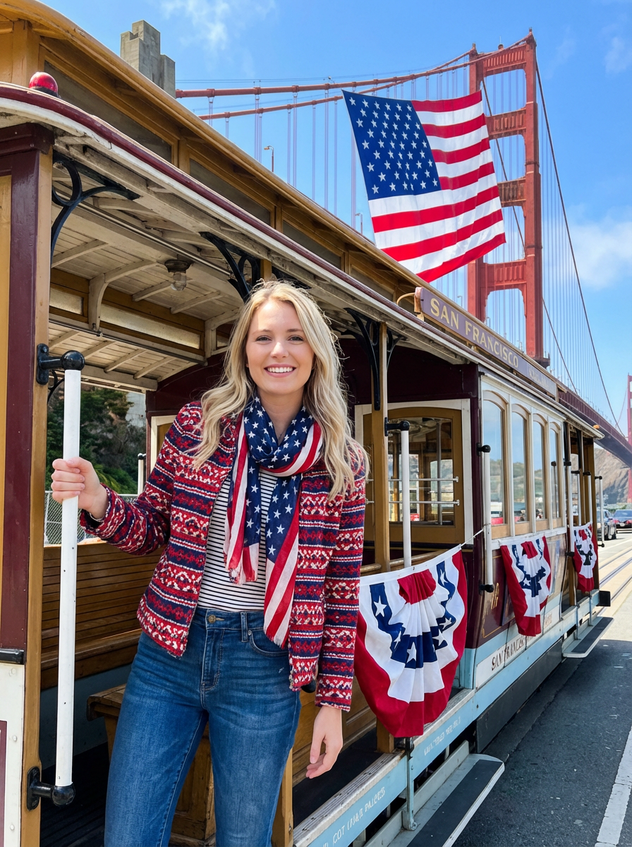 model on a San Francisco trolley decorated with patriotic bunting, wearing a stylish red, white and blue outfit with a stars and stripes scarf , Golden Gate Bridge draped with a giant American flag visible in the background, embodying iconic American city pride