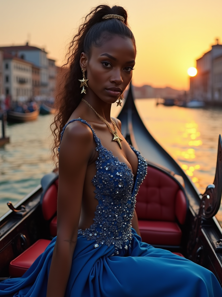 model on a Venice gondola at sunset, Grand Canal in the background, wearing a glamorous blue evening gown with gold star accessories , the golden light illuminating her face, historic buildings and bridges creating a timeless European scene
