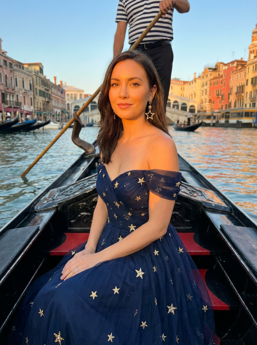 model on a Venice gondola at sunset, Grand Canal in the background, wearing a glamorous blue evening gown with gold star accessories , the golden light illuminating her face, historic buildings and bridges creating a timeless European scene