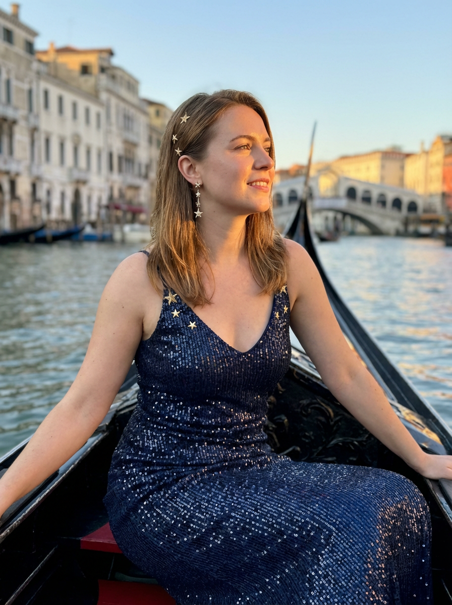 model on a Venice gondola at sunset, Grand Canal in the background, wearing a glamorous blue evening gown with gold star accessories , the golden light illuminating her face, historic buildings and bridges creating a timeless European scene