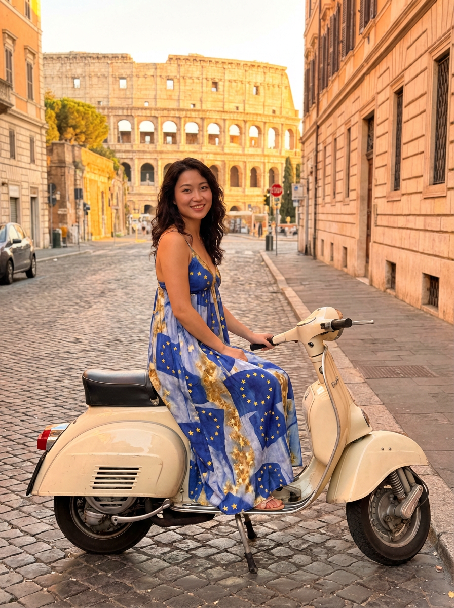 model on a vintage Vespa scooter in Rome, wearing a flowing sundress with European flag colors , the Colosseum visible in the background, golden hour sunlight creating a warm Mediterranean glow