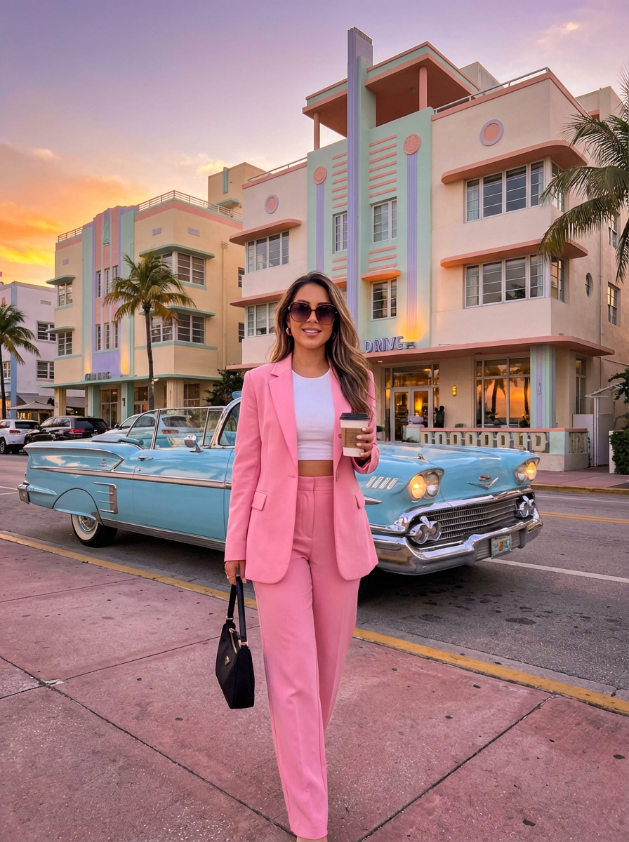 model on Ocean Drive, pastel art deco buildings, convertible car, glamorous Miami style, sunset