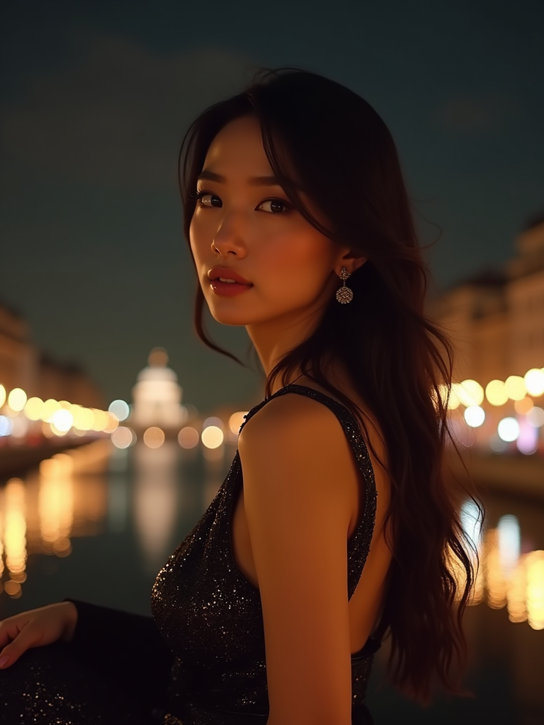 model on Pont Alexandre III at night, wearing a glamorous evening outfit , Seine River and city lights in background