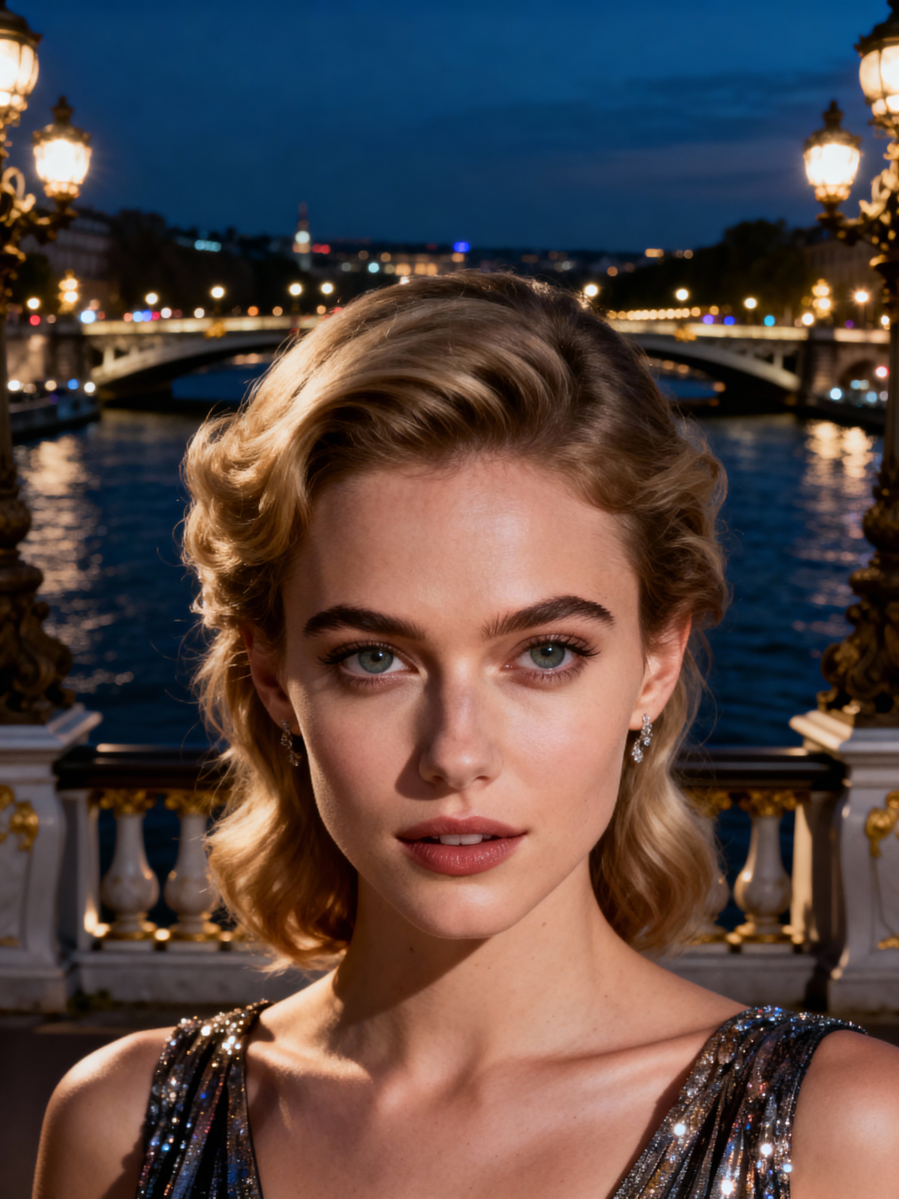 model on Pont Alexandre III at night, wearing a glamorous evening outfit , Seine River and city lights in background
