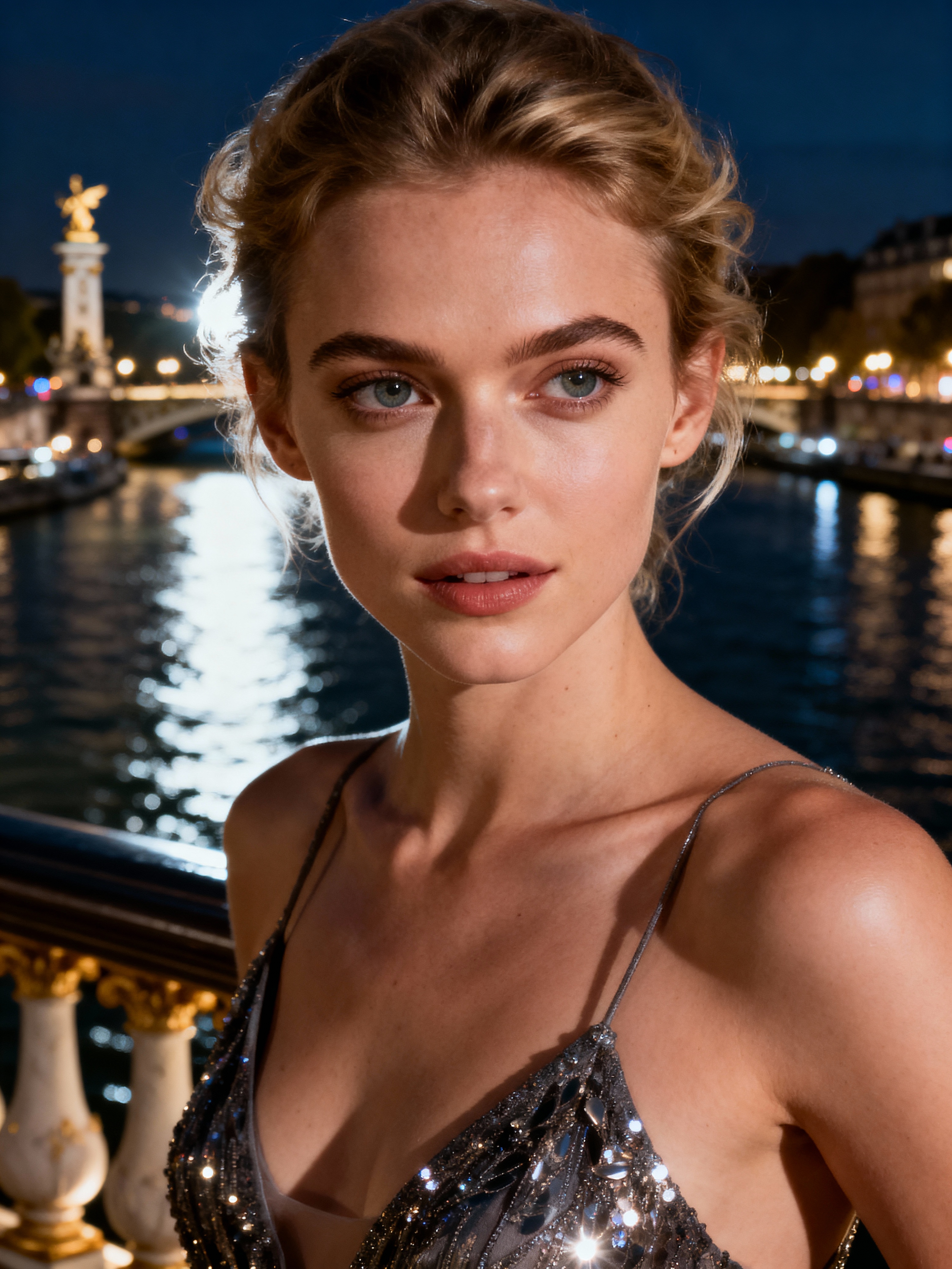 model on Pont Alexandre III at night, wearing a glamorous evening outfit , Seine River and city lights in background