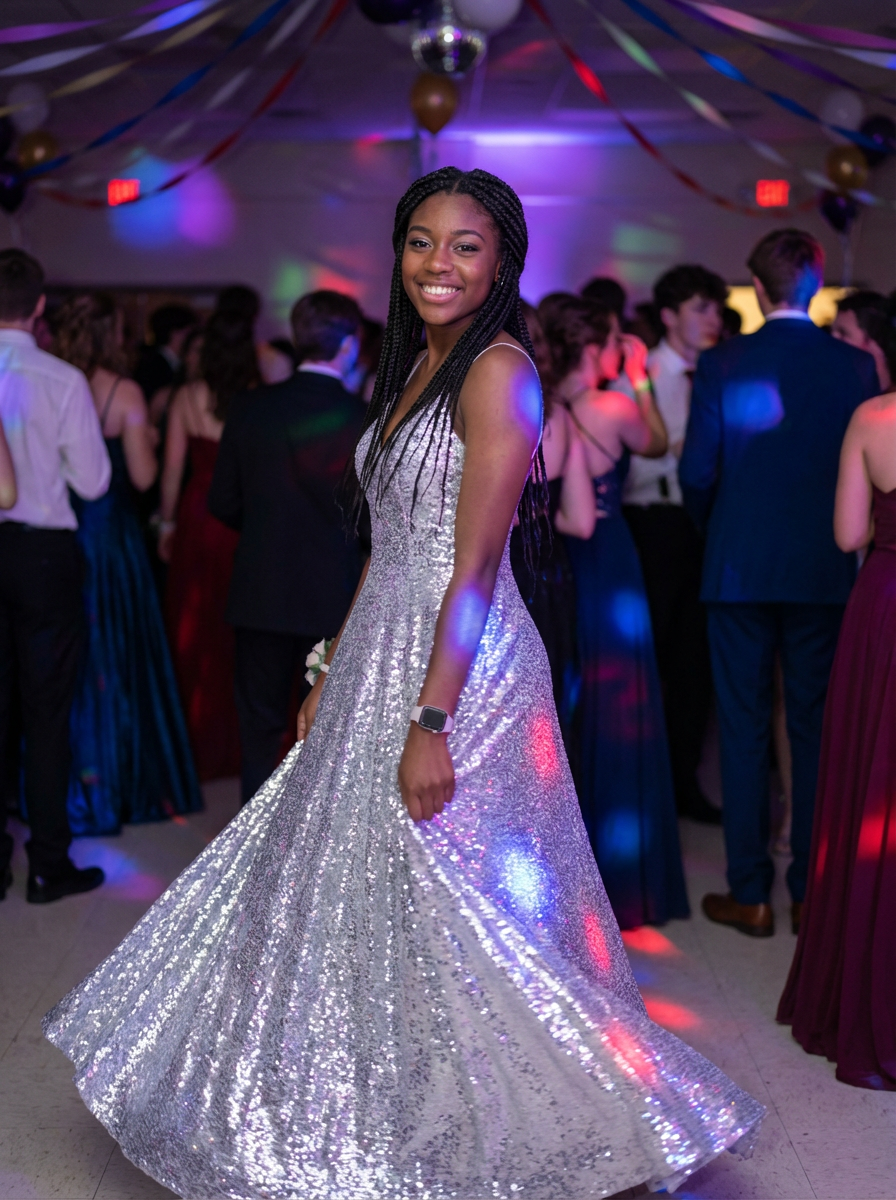 model on prom dance floor, twirling in dress , DJ lights, festive atmosphere