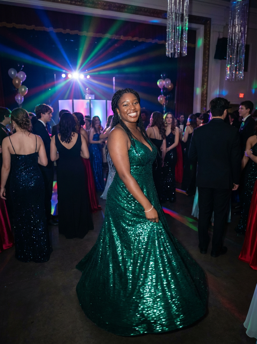 model on prom dance floor, twirling in dress , DJ lights, festive atmosphere