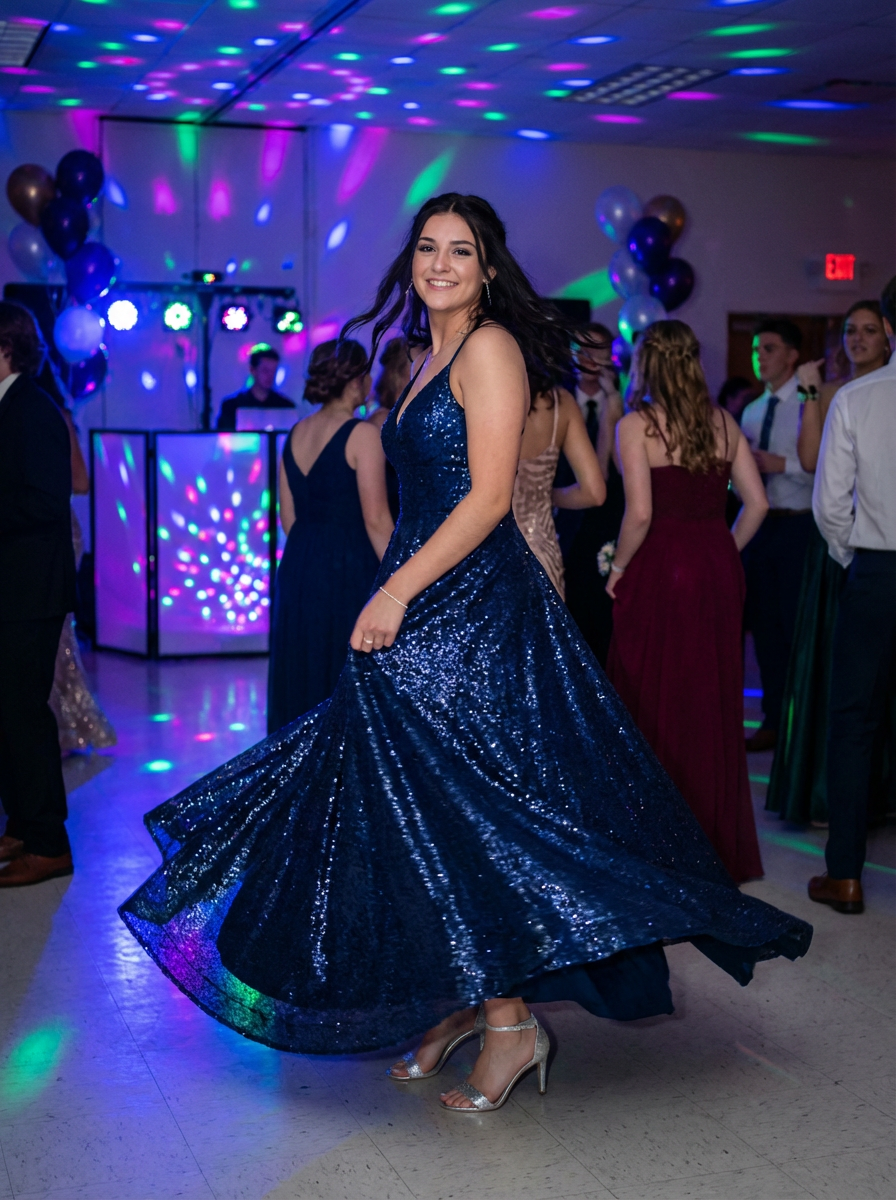 model on prom dance floor, twirling in dress , DJ lights, festive atmosphere