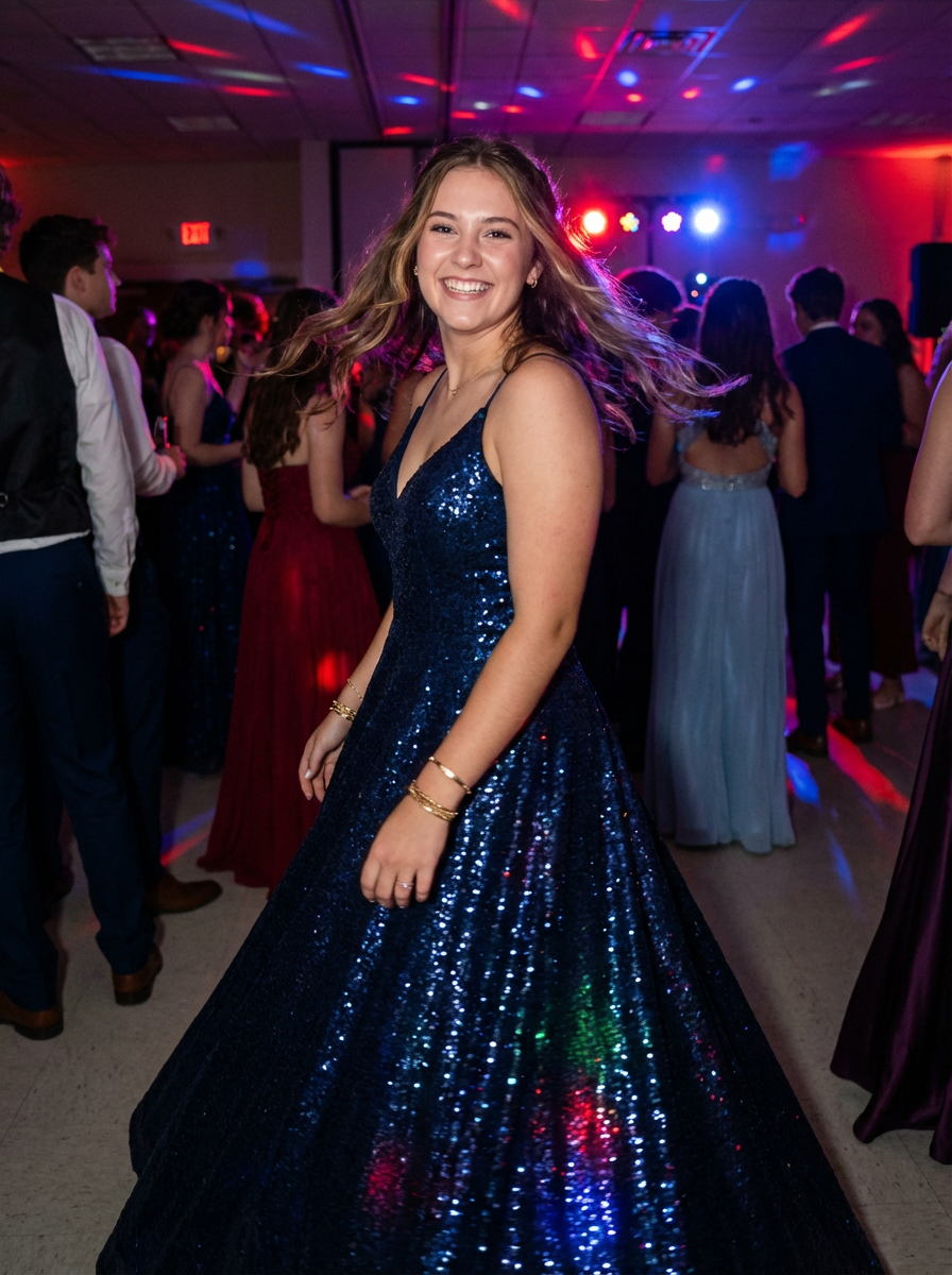 model on prom dance floor, twirling in dress , DJ lights, festive atmosphere