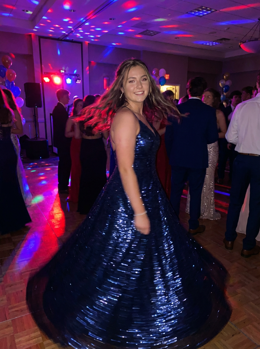model on prom dance floor, twirling in dress , DJ lights, festive atmosphere