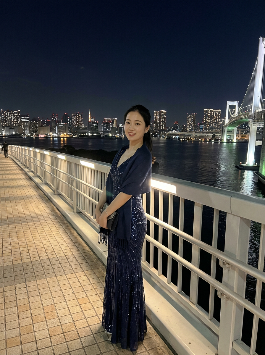 model on Rainbow Bridge at night, wearing a glamorous evening outfit , Tokyo Bay and city lights in background