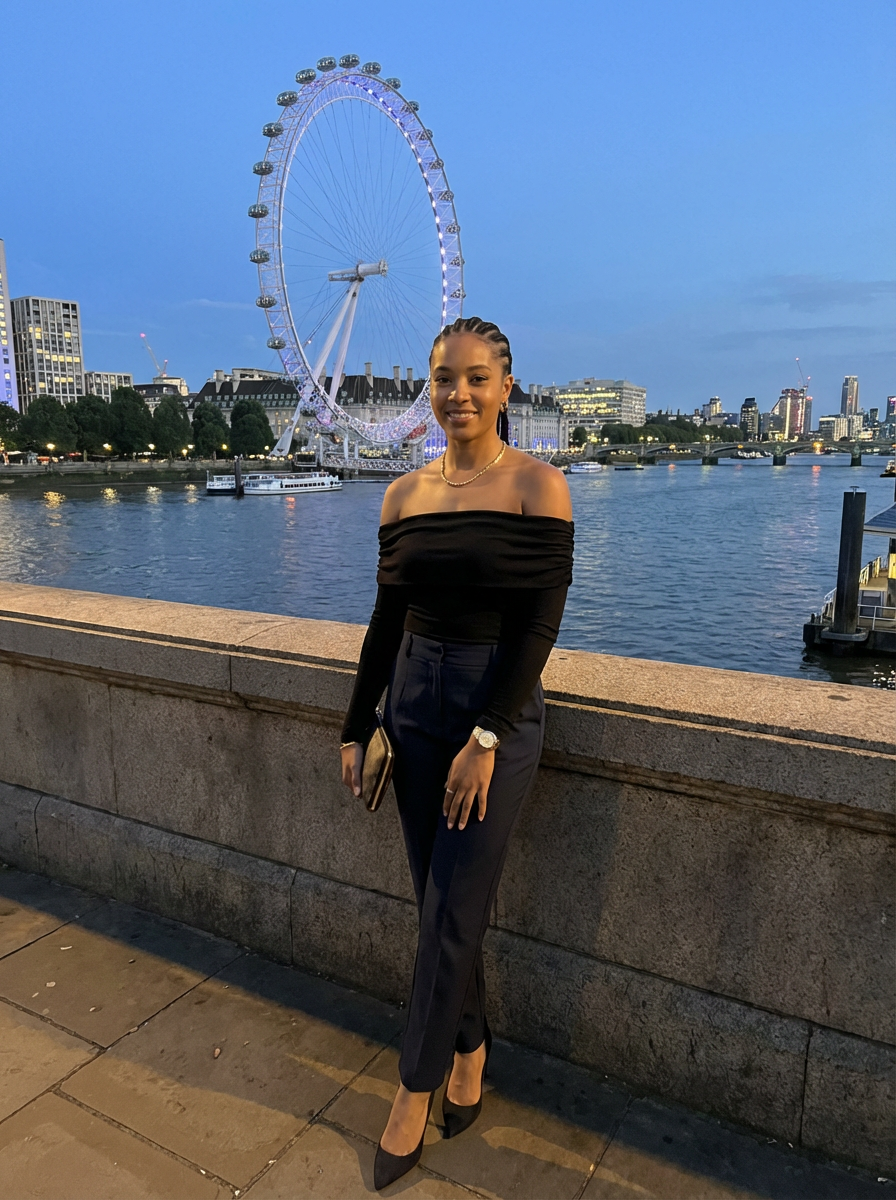 model on South Bank, London Eye and Thames, evening city lights, sophisticated outfit