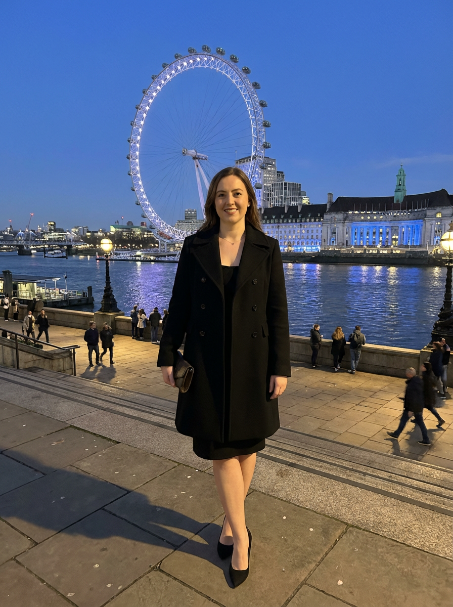 model on South Bank, London Eye and Thames, evening city lights, sophisticated outfit
