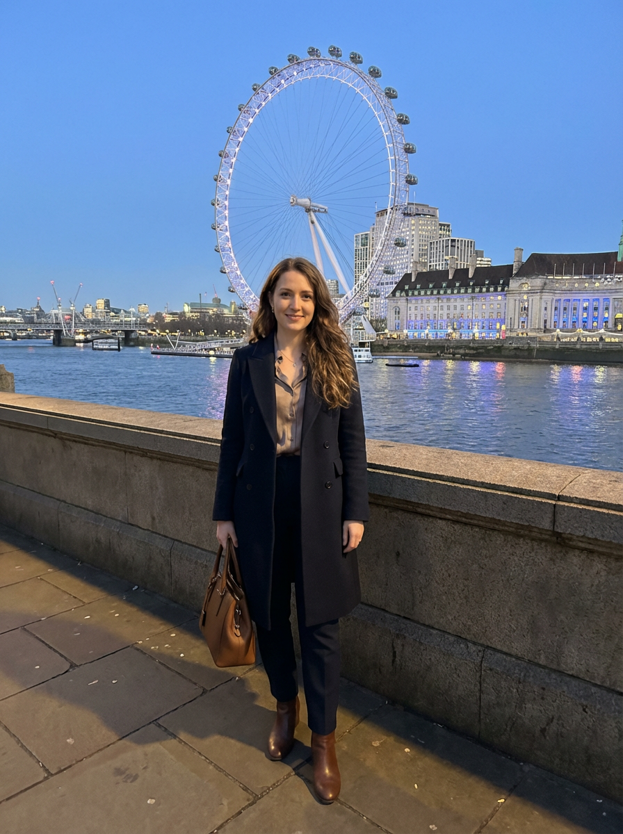 model on South Bank, London Eye and Thames, evening city lights, sophisticated outfit