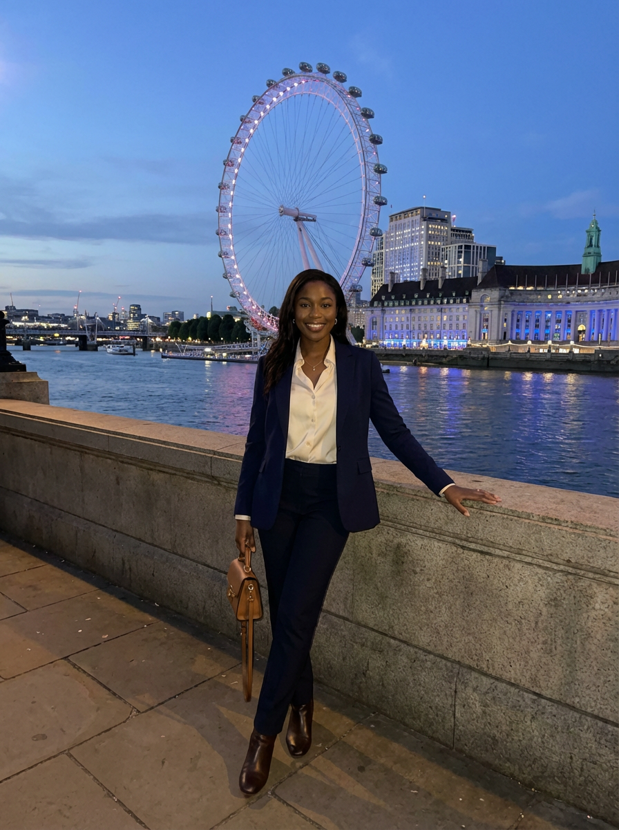 model on South Bank, London Eye and Thames, evening city lights, sophisticated outfit